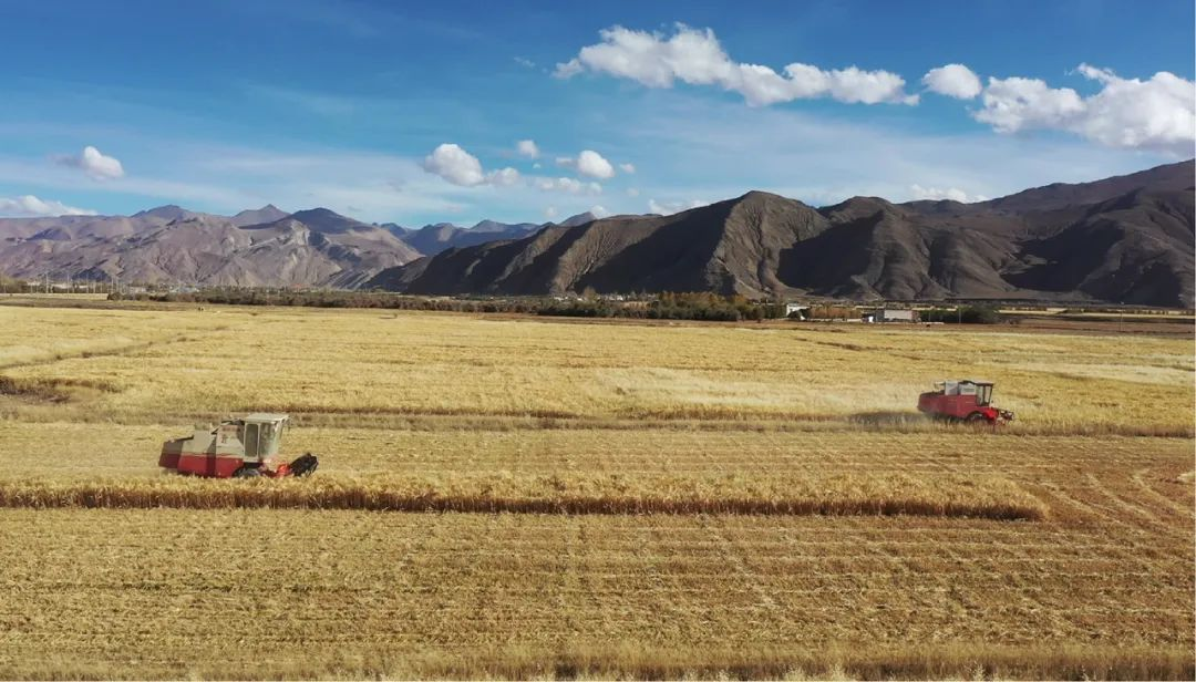 江孜縣盛產(chǎn)品種好、成色佳的青稞,被譽為“西藏糧倉”。每到豐收的季節(jié),年楚河畔,江孜城外彌漫著喜慶的氣氛。一望無垠的麥田在高原烈日的炙烤下,成熟的青稞散發(fā)出陣陣芳香,金色的青稞麥浪上下翻滾,藏家兒女忙著豐收,臉上不時露出豐收的喜悅。