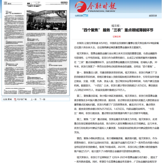 錢文揮表示,農(nóng)發(fā)行于近期制定了《2024-2025年普惠金融行動(dòng)方案》,提出了一系列具體措施。同時(shí),希望在今后普惠金融業(yè)務(wù)發(fā)展中,廣泛和金融同業(yè)相互學(xué)習(xí)、相互借鑒,在“三農(nóng)”相對(duì)比較薄弱的領(lǐng)域,進(jìn)一步加大金融投入力度,提高資金使用效率和成效,推動(dòng)農(nóng)村地區(qū)現(xiàn)代化步伐不斷加快。
