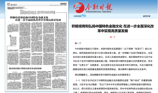 今年是新中國成立75周年,也是中國農業(yè)發(fā)展銀行(以下簡稱“農發(fā)行”)成立30周年。國務院批復的農發(fā)行分類分賬改革方案,進一步明確了農發(fā)行職能定位,對深化農發(fā)行改革發(fā)展具有重大意義。在深入實施改革進程中,我們要始終牢記習近平總書記關于走好中國特色金融發(fā)展之路、積極培育中國特色金融文化的重要論述,堅決貫徹“五要五不”實踐要求,充分發(fā)揮文化在深化改革中的引領作用,為全力服務強國建設和農發(fā)行高質量發(fā)展提供堅強思想保證、強大精神力量和有利文化條件。