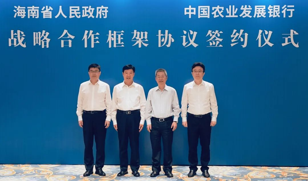 4月10日,中國(guó)農(nóng)業(yè)發(fā)展銀行與海南省人民政府在??诤炇?span style="font-weight: bold;">《政策性金融服務(wù)海南自由貿(mào)易港建設(shè)和鄉(xiāng)村振興戰(zhàn)略合作框架協(xié)議》。農(nóng)發(fā)行黨委書記、董事長(zhǎng)錢文揮,海南省委副書記、省長(zhǎng)劉小明出席簽約儀式,農(nóng)發(fā)行黨委委員、副行長(zhǎng)徐浩與海南省副省長(zhǎng)陳懷宇分別代表雙方簽署協(xié)議。海南省政府秘書長(zhǎng)符宣朝、農(nóng)發(fā)行戰(zhàn)略總監(jiān)杜彥坤參加。