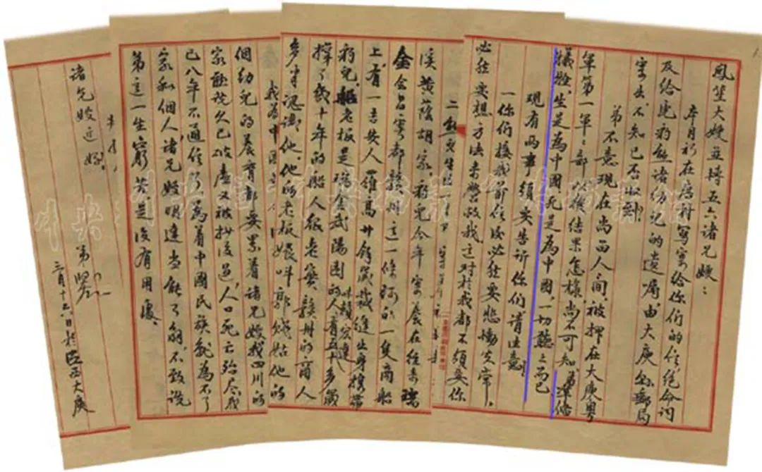 ……弟不意現(xiàn)在尚留人間,被押在大庾粵軍第一軍軍部,以后結(jié)果怎樣,尚不可知,弟準(zhǔn)備犧牲,生是為中國,死是為中國,一切聽之而已。現(xiàn)有兩事須要告訴你們,請注意。一、你們接我前信后必然要悲慟失常,必然要想方法來營救我……我為救中國而犯危險,遭損害,不需要找他們來營救我,幫助我,使他們?yōu)殡y……二、熊兒生后一月即寄養(yǎng)福建新泉芷溪黃蔭胡家……我為中國革命沒有一文錢的私產(chǎn),把三個幼兒的養(yǎng)育費要累著諸兄嫂……為著中國民族就為不了家和個人,諸兄嫂明達,當(dāng)能了解,不致說弟這一生窮苦,是沒有用處……