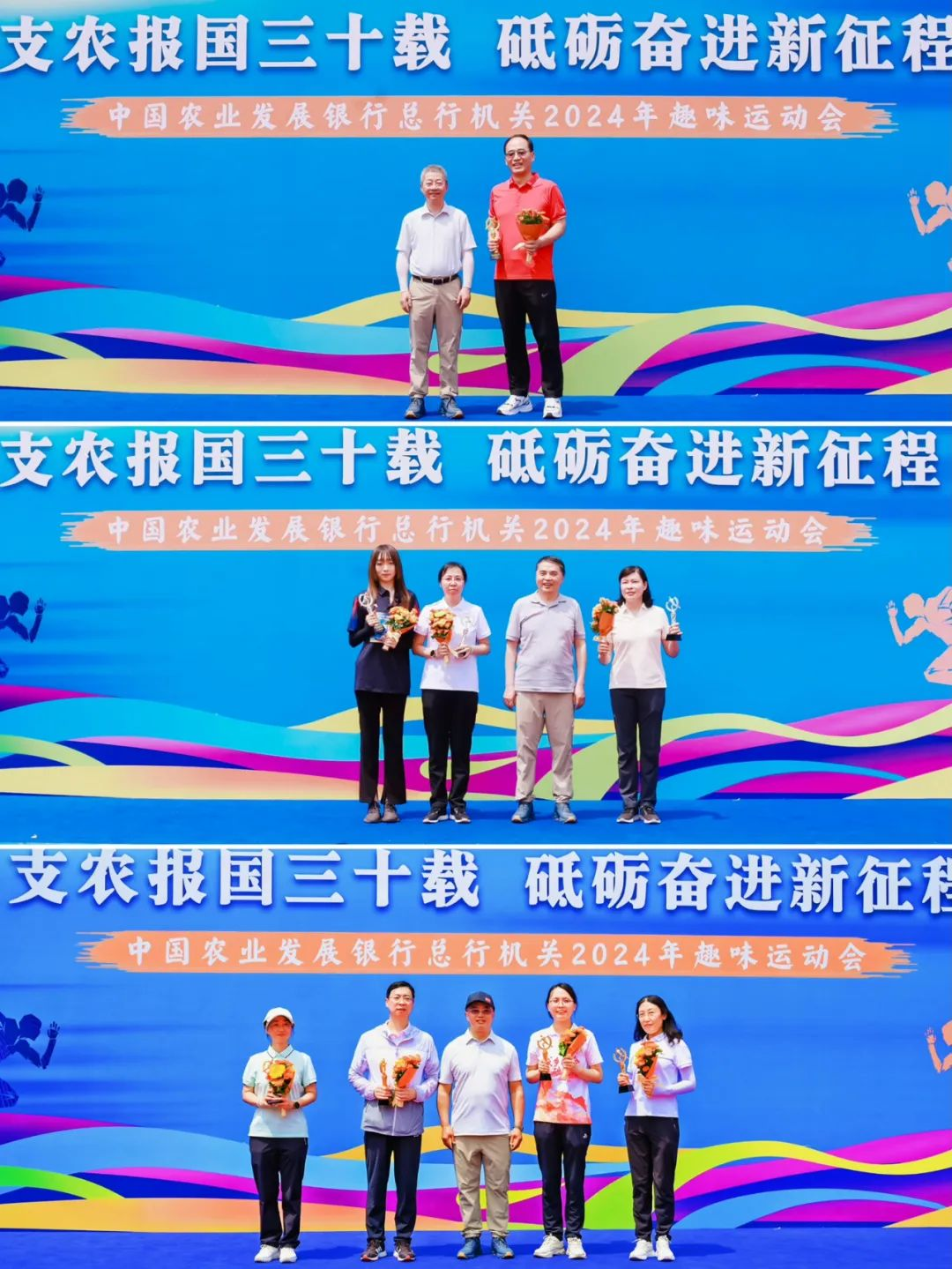 為積極響應(yīng)國家全民健身的號召,持續(xù)增強(qiáng)廣大職工身體素質(zhì),激勵廣大職工以昂揚(yáng)向上的精神面貌迎接新中國成立75周年和農(nóng)發(fā)行成立30周年,近日,農(nóng)發(fā)行總行機(jī)關(guān)舉辦“支農(nóng)報國三十載、砥礪奮進(jìn)新征程”2024年趣味運(yùn)動會。農(nóng)發(fā)行在京行領(lǐng)導(dǎo)全程參加,黨委書記、董事長錢文揮宣布運(yùn)動會開幕,黨委副書記、副董事長、行長湛東升致開幕辭,黨委委員、副行長、機(jī)關(guān)黨委書記徐一丁主持開幕式。運(yùn)動會共設(shè)置5個趣味運(yùn)動比賽項目,總行機(jī)關(guān)職工按部門編為27支代表隊參加各比賽項目,經(jīng)過激烈的角逐,總行營業(yè)部等8支代表隊分別獲得一、二、三等獎,錢文揮、湛東升、徐一丁分別為獲獎代表隊頒獎。
