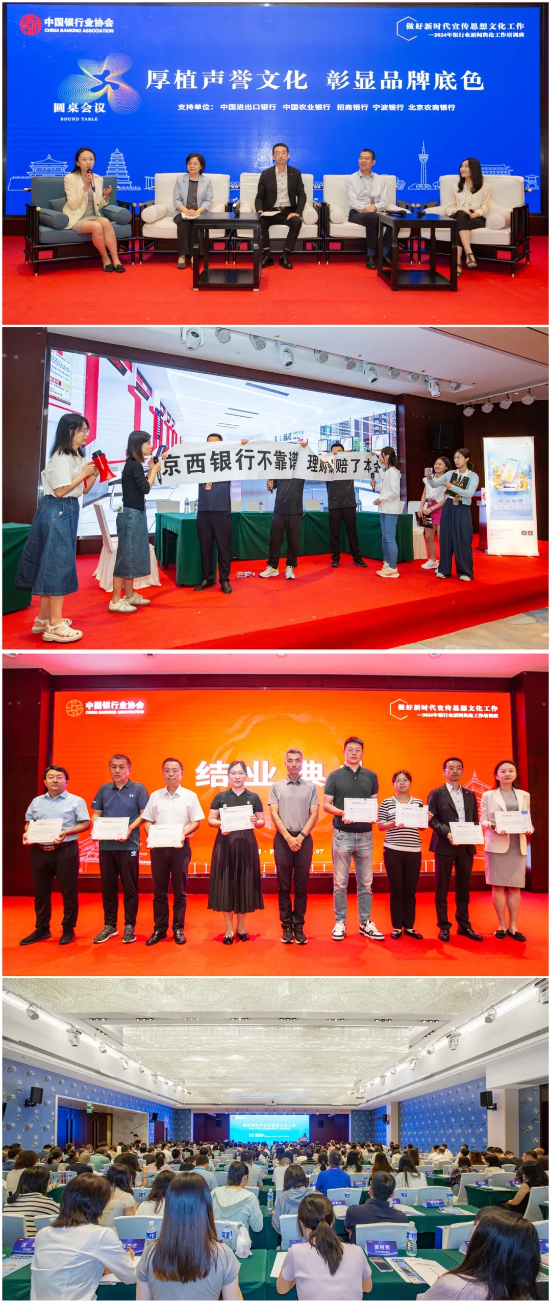 從上至下依次為:“厚植聲譽文化 彰顯品牌底色”圓桌會議,中國農(nóng)業(yè)銀行黨委宣傳部新聞中心資深專員楊雯雅、中國進出口銀行辦公室資深專員趙艷琳、招商銀行辦公室(黨委辦公室、黨委宣傳部)副主任王勝、寧波銀行董事會辦公室主任周煒、北京農(nóng)商銀行辦公室(安全保衛(wèi)部)總經(jīng)理助理駱曉霞等機構(gòu)代表分享經(jīng)驗成果;“劇本殺”實戰(zhàn)演練現(xiàn)場;中國農(nóng)業(yè)發(fā)展銀行企業(yè)文化部(黨委宣傳部)副總經(jīng)理、副部長胡文鋒向?qū)W員頒發(fā)結(jié)業(yè)證書;培訓(xùn)會場全景