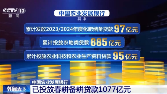 中國農(nóng)業(yè)發(fā)展銀行最新數(shù)據(jù)顯示,截至今年2月28日,農(nóng)發(fā)行支持春耕備耕累計(jì)投放貸款1077億元。其中,累計(jì)發(fā)放2023/2024年度化肥儲(chǔ)備貸款97億元;累計(jì)投放農(nóng)地類貸款885億元;累計(jì)投放農(nóng)業(yè)科技和農(nóng)業(yè)生產(chǎn)資料貸款95億元,有力地保障春耕備耕的順利進(jìn)行。(時(shí)思寧 王楠,朝聞天下;央視新聞客戶端)