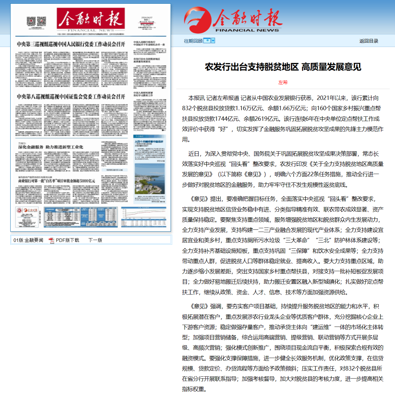 近日,為深入貫徹黨中央、國務(wù)院關(guān)于鞏固拓展脫貧攻堅成果決策部署,常態(tài)長效落實好中央巡視“回頭看”整改要求,農(nóng)發(fā)行印發(fā)《關(guān)于全力支持脫貧地區(qū)高質(zhì)量發(fā)展的意見》(以下簡稱《意見》),明確六個方面22條任務(wù)措施,推動全行進一步做好對脫貧地區(qū)的金融服務(wù),助力牢牢守住不發(fā)生規(guī)模性返貧底線。