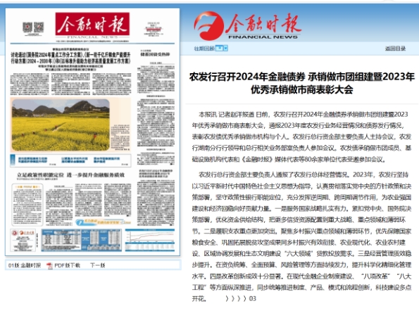 本報(bào)訊 記者趙洋報(bào)道 日前,農(nóng)發(fā)行召開(kāi)2024年金融債券承銷做市團(tuán)組建暨2023年優(yōu)秀承銷做市商表彰大會(huì),通報(bào)2023年度農(nóng)發(fā)行業(yè)務(wù)經(jīng)營(yíng)情況和債券發(fā)行情況,表彰農(nóng)發(fā)債優(yōu)秀承銷做市機(jī)構(gòu)與個(gè)人。農(nóng)發(fā)行總行資金部主要負(fù)責(zé)人主持會(huì)議,農(nóng)發(fā)行湖南分行行領(lǐng)導(dǎo)和總行相關(guān)業(yè)務(wù)部室負(fù)責(zé)人參加會(huì)議。農(nóng)發(fā)債承銷做市團(tuán)成員、基礎(chǔ)設(shè)施機(jī)構(gòu)代表和《金融時(shí)報(bào)》媒體代表等80余家單位代表受邀參加會(huì)議。