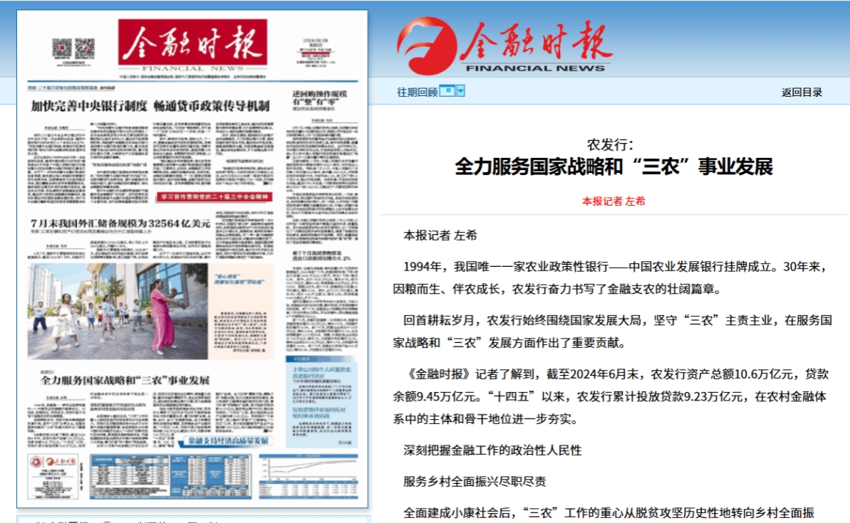 去年10月底中央金融工作會議召開后,農發(fā)行及時落實會議精神,聚焦重大戰(zhàn)略、重點領域和薄弱環(huán)節(jié),結合自身職能定位,謀劃做好金融五篇大文章,助力金融強國和農業(yè)強國建設有機融合。
