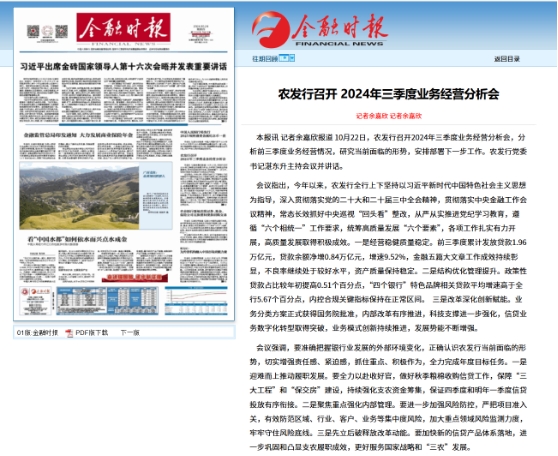 會(huì)議指出,今年以來(lái),農(nóng)發(fā)行全行上下堅(jiān)持以習(xí)近平新時(shí)代中國(guó)特色社會(huì)主義思想為指導(dǎo),深入貫徹落實(shí)黨的二十大和二十屆三中全會(huì)精神,貫徹落實(shí)中央金融工作會(huì)議精神,常態(tài)長(zhǎng)效抓好中央巡視“回頭看”整改,從嚴(yán)從實(shí)推進(jìn)黨紀(jì)學(xué)習(xí)教育,遵循“六個(gè)相統(tǒng)一”工作要求,統(tǒng)籌高質(zhì)量發(fā)展“六個(gè)要素”,各項(xiàng)工作扎實(shí)有力開(kāi)展,高質(zhì)量發(fā)展取得積極成效。一是經(jīng)營(yíng)穩(wěn)健質(zhì)量穩(wěn)定。前三季度累計(jì)發(fā)放貸款1.96萬(wàn)億元,貸款余額凈增0.84萬(wàn)億元,增速9.52%,金融五篇大文章工作成效持續(xù)彰顯,不良率繼續(xù)處于較好水平,資產(chǎn)質(zhì)量保持穩(wěn)定。二是結(jié)構(gòu)優(yōu)化管理提升。政策性貸款占比較年初提高0.51個(gè)百分點(diǎn),“四個(gè)銀行”特色品牌相關(guān)貸款平均增速高于全行5.67個(gè)百分點(diǎn),內(nèi)控合規(guī)關(guān)鍵指標(biāo)保持在正常區(qū)間。 三是改革深化創(chuàng)新賦能。業(yè)務(wù)分類方案正式獲得國(guó)務(wù)院批準(zhǔn),內(nèi)部改革有序推進(jìn),科技支撐進(jìn)一步強(qiáng)化,信貸業(yè)務(wù)數(shù)字化轉(zhuǎn)型取得突破,業(yè)務(wù)模式創(chuàng)新持續(xù)推進(jìn),發(fā)展勢(shì)能不斷增強(qiáng)。