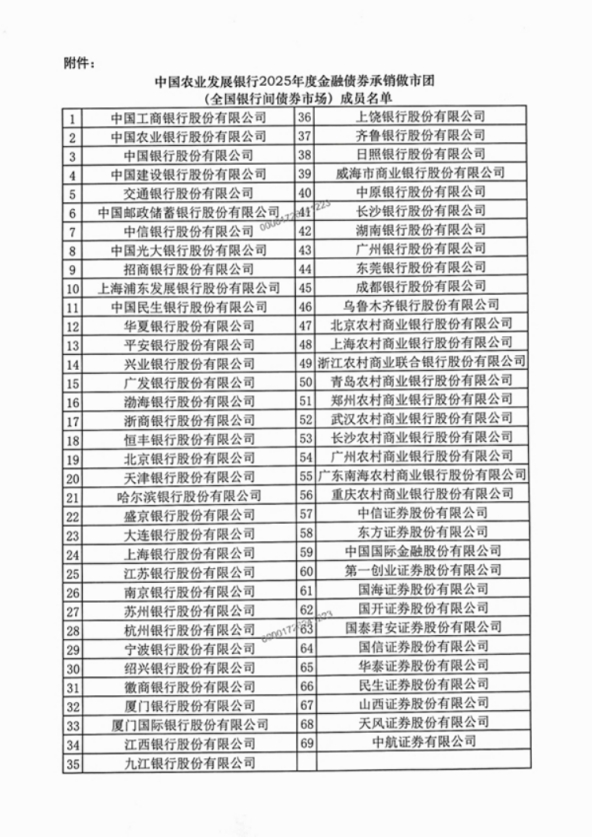新華財(cái)經(jīng)北京12月25日電 中國(guó)農(nóng)業(yè)發(fā)展銀行25日在中國(guó)貨幣網(wǎng)、中國(guó)債券信息網(wǎng)和上海清算所官方網(wǎng)站等平臺(tái)公布2025年度金融債券承銷(xiāo)做市團(tuán)(全國(guó)銀行間債券市場(chǎng))成員名單,成員共69家。2025年,農(nóng)發(fā)行將主動(dòng)對(duì)接行內(nèi)資金需要,適當(dāng)增加債券發(fā)行規(guī)模,加快年初債券發(fā)行節(jié)奏,有力服務(wù)國(guó)家戰(zhàn)略和鄉(xiāng)村全面振興。