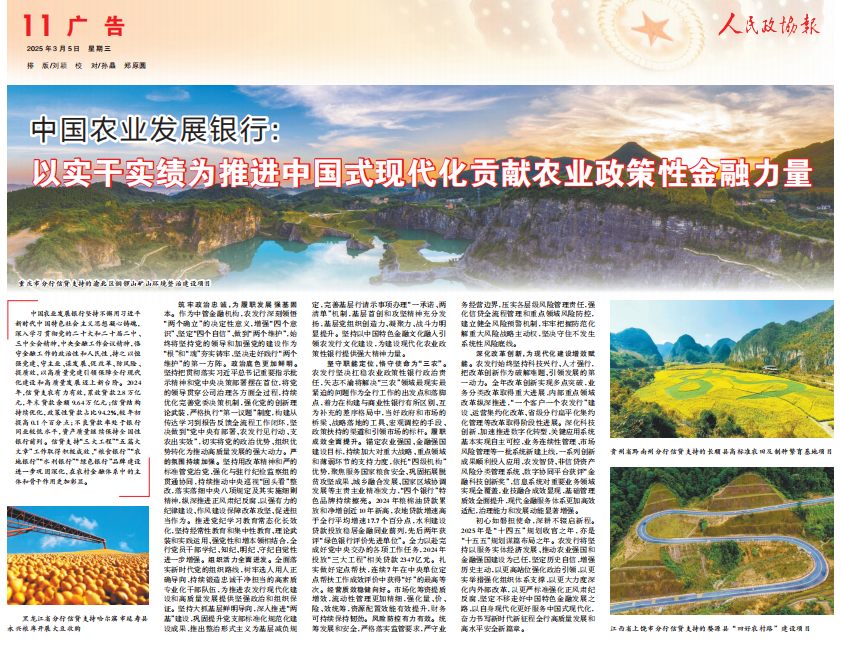 中國農(nóng)業(yè)發(fā)展銀行堅持不懈用習(xí)近平新時代中國特色社會主義思想凝心鑄魂,深入學(xué)習(xí)貫徹黨的二十大和二十屆二中、三中全會精神,中央金融工作會議精神,恪守金融工作的政治性和人民性,持之以恒強黨建、守主業(yè)、謀發(fā)展、促改革、防風(fēng)險、提質(zhì)效,以高質(zhì)量黨建引領(lǐng)保障全行現(xiàn)代化建設(shè)和高質(zhì)量發(fā)展邁上新臺階。2024年,信貸支農(nóng)有力有效,累放貸款2.8萬億元,年末貸款余額9.64萬億元;信貸結(jié)構(gòu)持續(xù)優(yōu)化,政策性貸款占比94.2%,較年初提高0.1個百分點;不良貸款率處于銀行同業(yè)較低水平,資產(chǎn)質(zhì)量繼續(xù)保持全國性銀行前列。信貸支持“三大工程”“五篇大文章”工作取得積極成效,“糧食銀行”“農(nóng)地銀行”“水利銀行”“綠色銀行”品牌建設(shè)進一步鞏固深化,在農(nóng)村金融體系中的主體和骨干作用更加彰顯。