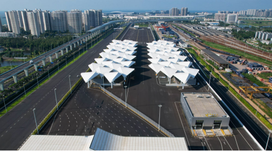 這是2025年9月23日拍攝的??谛潞8酆湍细邸岸€口岸”(貨運(yùn))集中查驗(yàn)場(chǎng)海關(guān)查驗(yàn)區(qū)(無(wú)人機(jī)照片)。新華社記者 楊冠宇 攝