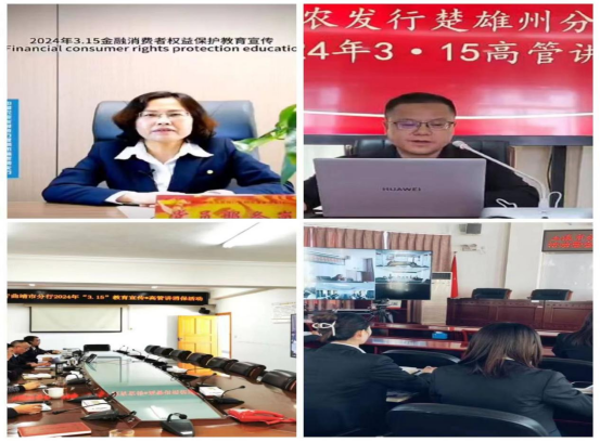 結(jié)合活動(dòng)要求和工作實(shí)際,各級(jí)行圍繞主題,開(kāi)展“金融高管講消保”活動(dòng)。曲靖市分行通過(guò)視頻宣講方式,面向全行干部職工講解客戶(hù)投訴的概念、處理流程等內(nèi)容;玉溪市分行帶頭在全轄2024年“3·15”金融消費(fèi)者權(quán)益保護(hù)教育宣傳活動(dòng)暨金融消費(fèi)者保護(hù)服務(wù)平臺(tái)上線(xiàn)工作部署視頻會(huì)議上做了《提升站位 加強(qiáng)消費(fèi)者權(quán)益保護(hù)工作》的消保宣講;楚雄州分行結(jié)合農(nóng)發(fā)行工作實(shí)際從3個(gè)方面分析講解如何做好金融消保工作;潘家灣支行以《用心守護(hù)金融消費(fèi)者權(quán)益》為主題,用通熟易懂的語(yǔ)言向大眾宣講金融消費(fèi)者享有的八項(xiàng)基本權(quán)利。通過(guò)高管帶頭抓消保、講消保,將消保嵌入經(jīng)營(yíng)管理全流程,形成從業(yè)人員人人參與、人人盡責(zé)的金融消保教育宣傳氛圍。